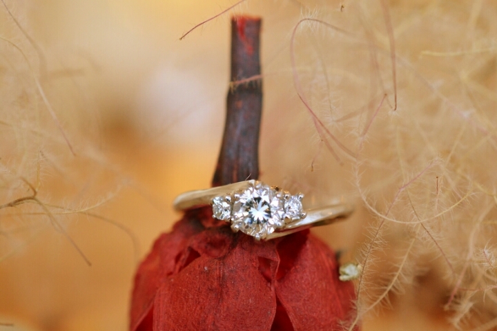 シンプルな婚約指輪と木目柄の